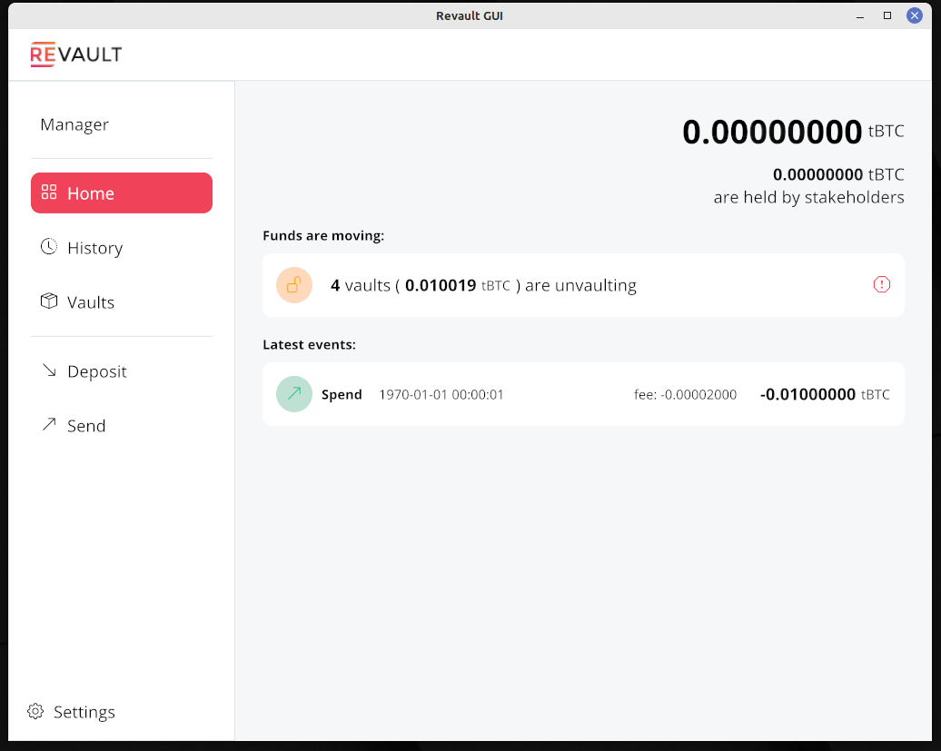 Later I came across Revault GUI. It provides a GUI to the Revault daemon revaultd. The latter in turn is a core implementation of the wallet from the Revault protocol which is a Bitcoin architecture for multi-party transactions/situations. None of that is relevant to me and I didn’t have any knowledge of it prior to starting.
